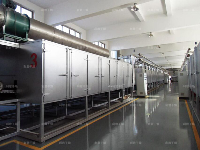 物料由加料器均勻地鋪在網帶上,網帶一般采用12-60目不銹鋼絲網,由傳動裝置拖動在干燥機內移動。干燥機由若干單元組成,每一單元熱風獨立循環,部分尾氣由專門排濕風機排出,廢氣由調節閥控制,熱氣由下往上或由上往下穿過鋪滿物料的網帶完成熱量與質量傳遞的進程,帶走物料水份。網帶緩慢移動,運行速度可根據物料溫度自由調節,干燥后的成品連續落入收料器中。上下循環單元根據用戶需要可靈活配備,單元數量亦可根據需要選取。
