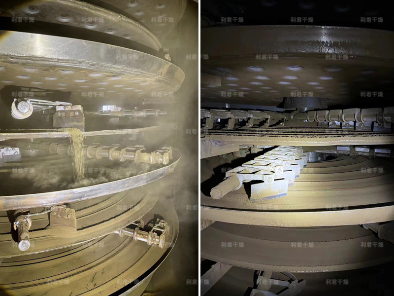 濕物料自加料器連續地加到干燥器上部第一層干燥盤上,帶有耙葉的耙臂作回轉運動使耙臂作回轉運動使耙葉連續地翻抄物料。物料沿指數螺旋線流過干燥盤表面,在小干燥盤上的物料被移送到外緣,并在外緣落到下方的大干燥盤外緣,在大干盤上物料向里移動并從中間落料口落如下一層小干燥盤中。大小干燥盤上下交替排列,物料得以連續地流過整個干燥器。中空的干燥盤內通入加熱介質,加熱介質形式有飽和蒸汽、熱水和導熱油,加熱介質由干燥盤的一端進入,從另一端導出。已干物料從最后一層干燥盤落到殼體的底層,最后被耙葉移送到出料口排出。濕份從物料中逸出,由設在頂蓋上的排濕口排出,真空型盤式干燥器的濕氣由設在頂蓋上的真空泵口排出。從底層排出的干物料可直接包裝。通過配加翅片加熱器、溶劑回收冷凝器、袋式除塵器、干料返混機構、引風機等輔機,可提高其干燥的生產能力,干燥膏糊狀和熱敏性物 料,可方便地回收溶劑,并能進行熱解和反應操作。