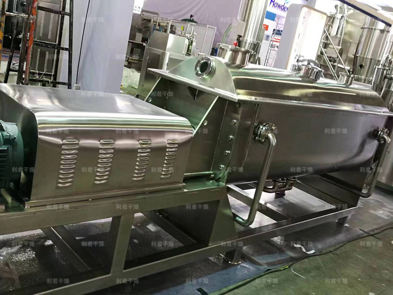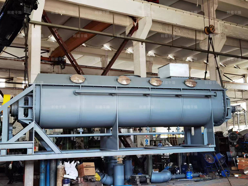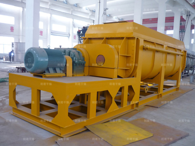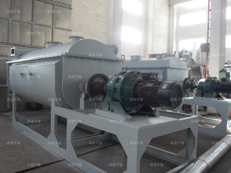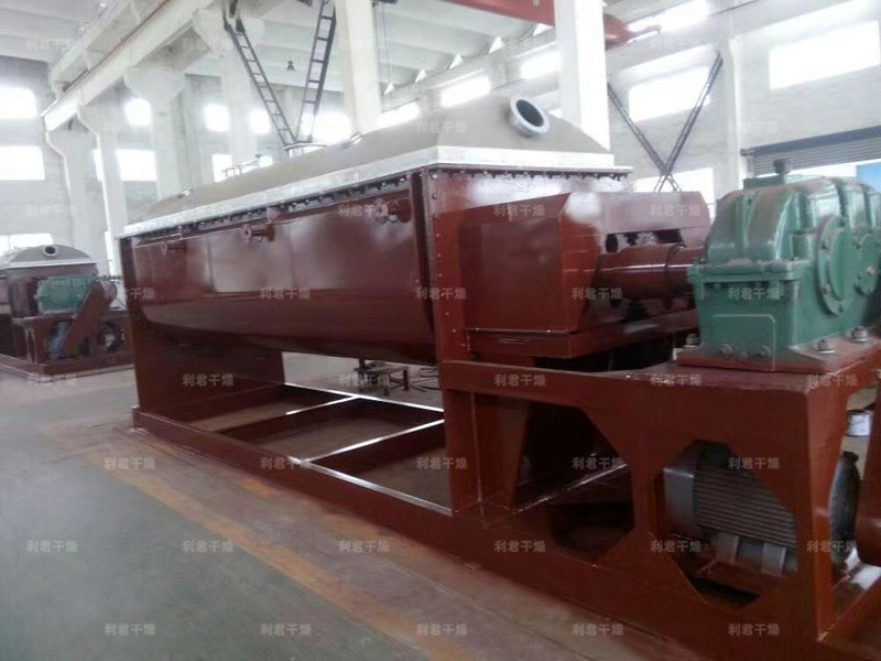 空心軸上密集排列著楔型中空漿葉,熱介質(zhì)經(jīng)空心軸流經(jīng)漿葉。單位有效容積內(nèi)傳熱面積很大,熱介質(zhì)溫度從-40℃到320℃,可以是水蒸汽,也可以是液體型:如熱水、導(dǎo)熱油等。間接傳導(dǎo)加熱,沒有攜帶空氣帶走熱量,熱量均用來加熱物料。熱量損失僅為通過器體保溫層向環(huán)境的散熱。楔型漿葉傳熱面具有自清潔功能。物料顆粒與楔型面的相對運(yùn)動產(chǎn)生洗刷作用,能夠洗刷掉楔型面上附著物料,使運(yùn)轉(zhuǎn)中一直保持著清潔的傳熱面。漿葉干燥機(jī)的殼體為Ω型,殼體內(nèi)一般安排二到四根空心攪拌軸。殼體有密封端蓋與上蓋,防止物料粉塵外泄而充分發(fā)揮作用。